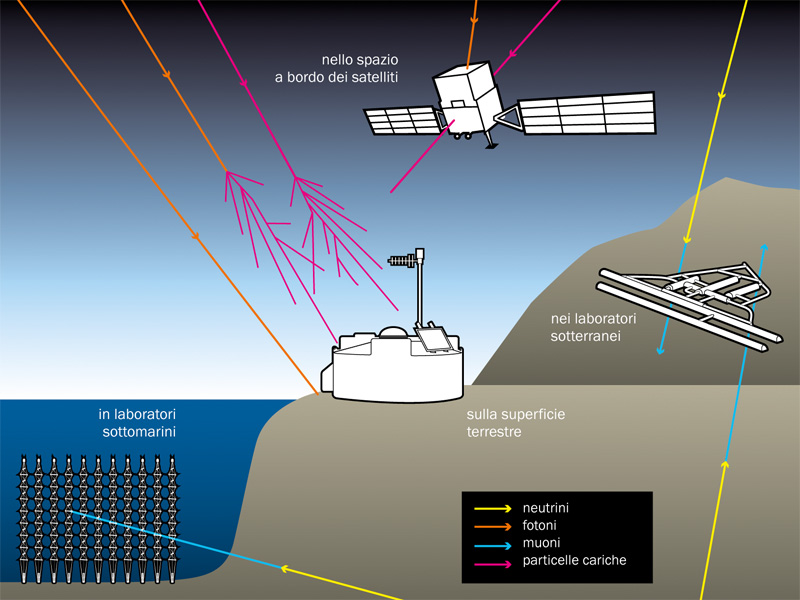 I "messaggi dallo spazio" sono raccolti in luoghi e con tecniche diversi: le particelle cariche e i fotoni delle varie energie sono rivelati a terra o su satellite (vd. approfondimento "Tutti i colori dell'Universo"), mentre i neutrini si riescono a "vedere" solo schermandosi dal resto dei raggi cosmici, in grandi istallazioni sotterranee o sottomarine. Ma i neutrini possono arrivare anche dal sottosuolo, dopo aver attraversato quasi tutta la Terra! Tra i modi di interazione, comunque rarissimi, quello più utile per rivelare i neutrini è l'urto con la produzione di un muone: lasciando traccia negli strumenti è il muone a segnalare il neutrino iniziale.