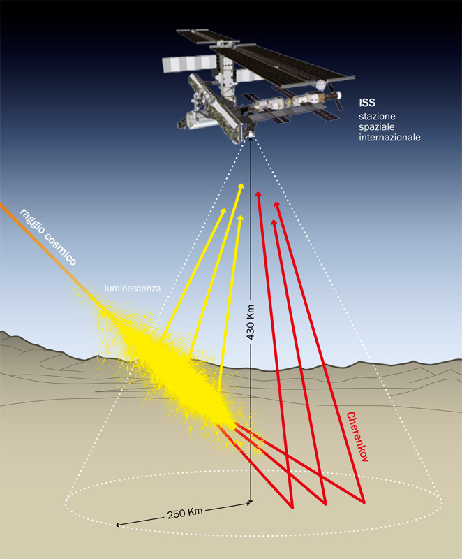 Usare l'atmosfera del nostro pianeta come un grande rivelatore per osservare i raggi cosmici, non da terra ma dallo spazio. Questo è ciò che vuole realizzare il progetto Jem-Euso (Japanese Experiment Module - Extreme Universe Space Observatory). Si tratta di una proposta nata da un'idea italiana e recentemente rilanciata da una iniziativa internazionale coordinata dalla Agenzia Spaziale Giapponese (Jaxa), che diventerebbe così il primo esperimento spaziale per lo studio della radiazione cosmica di altissima energia. Quando i raggi cosmici di alta energia interagiscono con l'atmosfera formano un striscia fluorescente (nella frequenza degli ultravioletti) lunga fino a 100 km, che può essere osservata nel cielo notturno da un telescopio posto al di fuori dell'atmosfera terrestre. La fluorescenza è indotta nell'azoto dalle particelle secondarie cariche dello sciame come risultato di un complesso processo relativistico a cascata. Oltre alla luce di fluorescenza, vi sarà anche la luce emessa per effetto Cherenkov lungo lo sciame, ricco di elettroni ultrarelativistici: parte di questa luce, riflessa sul terreno, raggiungerà il telescopio di Euso. Euso sarà collocato a bordo della Stazione Spaziale Internazionale (Iss) e osserverà, da un'altezza di oltre 400 km, i raggi cosmici che interagiscono con l'atmosfera della Terra, per trovare una risposta ai quesiti fondamentali sulla loro natura, la loro origine e la storia che portano con sé.