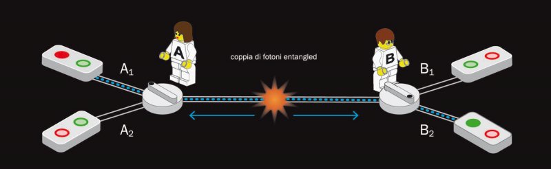 Coppie di fotoni entangled possono essere generate eccitando un cristallo particolare, detto non lineare, con un fascio di fotoni, tipicamente ultravioletti, molto intenso. All’interno del cristallo, alcuni fotoni del fascio possono dividersi in coppie di fotoni, che si trovano in stati di polarizzazione correlati tra loro e risultano quindi entangled. I due fotoni vengono quindi inviati rispettivamente ad Alice e Bob. Alice osserva la polarizzazione del fotone ricevuto in due possibili misurazioni, denominate A1 o A2. La scelta di quale misurazione effettuare è casuale e dunque non può essere influenzata da Bob, essendo i due sperimentatori lontani spazio-temporalmente. La misurazione effettuata da Alice è dicotomica, ovvero con due possibili risultati (raffigurati con verde o rosso). La misurazione A1 ha come possibili esiti una polarizzazione orizzontale (ad esempio, verde) o una polarizzazione verticale (rosso). La misurazione A2 ha invece come possibili esiti una polarizzazione a +45° (verde) oppure a -45° (rosso). Allo stesso modo Bob osserva la polarizzazione del suo fotone con due possibili misurazioni B1 e B2, con direzioni intermedie rispetto a quelle delle misurazioni adoperate da Alice. Successivamente, Alice e Bob confrontano i risultati ottenuti, in modo da verificare se sono correlati o scorrelati. Dai dati sperimentali si misura il grado di correlazione, che per una teoria a variabili nascoste dovrebbe essere minore di una quantità fissata dalla diseguaglianza di Bell, mentre risulta maggiore di questa quantità per gli stati entangled.