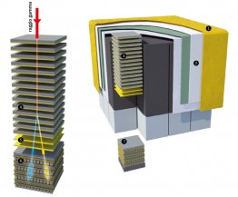 Schema del Lat, Large Area Telescope, il rivelatore di raggi gamma di alta energia, collocato a bordo del satellite Fermi: 1. Scudo termico - Riveste l’intera struttura e costituisce la coperta termica e lo scudo di protezione dalle micrometeoriti che potrebbero colpire e danneggiare lo strumento. 2. Rivelatori di anticoincidenza - Uno strato di rivelatori a scintillazione segnala l‘ingresso di particelle cariche e le distingue dai raggi gamma. 3. Tracciatore - È un apparato in grado di ricostruire con grande precisione la traiettoria delle particelle cariche. È costituito da strati alternati di tungsteno e di rivelatori al silicio. 4. Lastra di tungsteno - All’interno un raggio gamma di energia superiore a un milione di elettronVolt crea due particelle, un elettrone e un antielettrone. 5. Rivelatori di silicio - Determinano la traiettoria delle due particelle prodotte dall’interazione del fotone con la lastra di tungsteno. 6. Calorimetro elettromagnetico - Misura l’energia depositata dalle due particelle, elettrone e antielettrone. 7. Barre di scintillatore - All’interno di 8 strati di barrette di ioduro di cesio, ad orientamento alternato, elettrone ed anti-elettrone producono due sciami elettromagnetici, con emissione di luce di scintillazione, misurando la quale si risale all’energia delle due particelle.