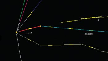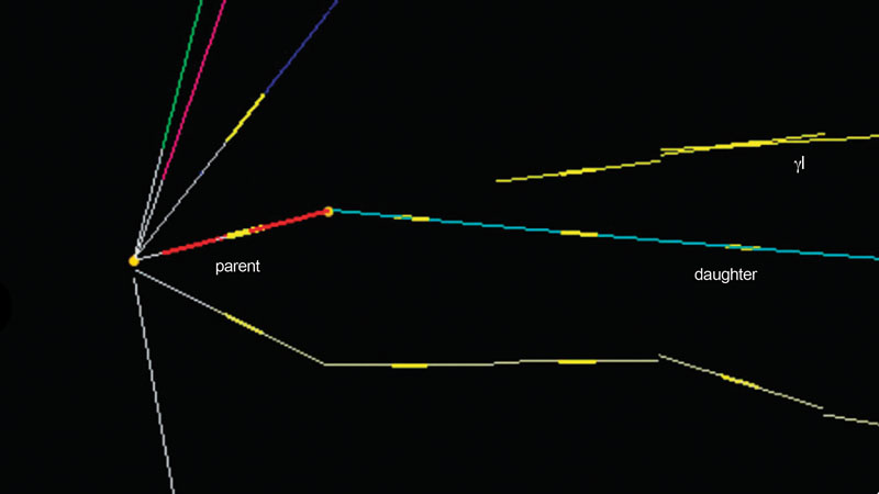 Immagine del primo evento tau e del suo decadimento misurato in Opera nel maggio del 2010.