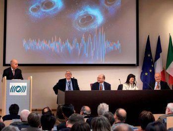 Un momento della conferenza stampa dell’annuncio della scoperta delle onde gravitazionali a Virgo (Cascina, vicino Pisa). Da sinistra, Federico Ferrini (direttore del consorzio Ego), Fulvio Ricci (spokesperson della collaborazione Virgo), Albert Lazzarini (Ligo), Catherine-Nary Man (direttrice di Artemis, Cnrs) e Adalberto Giazotto (co-fondatore di Virgo).