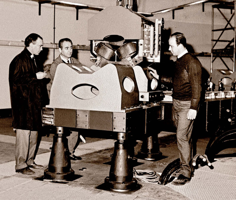 Il fisico austriaco Bruno Touschek (il primo da sinistra), uno dei pionieri delle ricerche sugli acceleratori di particelle, nell’of cina “Magneti” dei Laboratori Infn di Frascati alla fine degli anni ’50. Touschek propose e poi diresse la costruzione dell’Anello di Accumulazione (Ada), nel quale per la prima volta circolarono insieme, per poi collidere frontalmente, un fascio di elettroni e uno delle loro antiparticelle, i positroni.