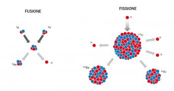 b.A sinistra il processo di fusione nucleare di un nucleo di deuterio (2H) e uno di trizio (3H). Nei reattori che attualmente producono energia nucleare avviene il processo “inverso”, quello chiamato di “fissione nucleare” (a destra nella figura). Le reazioni di fissione utilizzano come combustibile elementi chimici molto pesanti, come l’uranio (U) o il plutonio (Pt), la cui massa atomica è superiore a 200. Questi nuclei, inizialmente bombardati con neutroni dall’esterno, si scindono (da cui il termine fissione) producendo elementi più leggeri, nel caso in figura il kripton (Kr) e il bario (Ba) e altri neutroni. I nuovi neutroni, a loro volta, danno origine ad altre fissioni del combustibile, permettendo alla reazione di “autosostenersi” e creare energia utilizzabile dall’uomo.