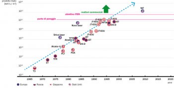 c.Un reattore a fusione è caratterizzato dal prodotto tra densità atomica, tempo di confinamento e temperatura (prodotto triplo). Un obiettivo di riferimento è il cosiddetto punto di pareggio (break-even), cioè quando l’energia utilizzata per scaldare il plasma è uguale all’energia prodotta dalla fusione. La figura mostra l’evoluzione nel tempo del prodotto triplo per alcuni impianti realizzati in vari Paesi. Si nota una crescita delle prestazioni simile p. es. a come si sono evoluti i microprocessori. I reattori a fusione sono di due tipi principali: i reattori “a confinamento magnetico” (i cerchi rossi in fig. c) e i reattori a fusione “inerziale” (cerchi blu). Nei primi il plasma viene riscaldato fino a decine o centinaia di milioni di gradi e confinato mediante campi magnetici. Nei secondi si utilizzano potentissimi laser o fasci di particelle per comprimere e riscaldare piccole sfere di combustibile in cui innescare la fusione. Il confronto qui riportato tra le due famiglie di impianti, che hanno caratteristiche molto diverse, è puramente indicativo. Inoltre, per il passaggio a impianti commerciali non basta il prodotto triplo, ma è richiesto un guadagno netto di energia per tempi sufficientemente lunghi.