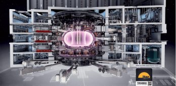 d.In figura è mostrato uno schema del futuro reattore sperimentale a fusione Iter all’interno del suo edificio in cemento. Al centro si intravede la struttura toroidale della camera a vuoto in cui viene confinato il plasma (illustrato con un colore violetto). Intorno e al centro del Tokamak sono situate le bobine che producono i campi magnetici necessari al funzionamento della macchina. Tutto intorno sono illustrate le strutture che costituiscono l’impianto nel suo insieme (sistemi di raffreddamento, alimentazioni elettriche, controlli, ecc.).