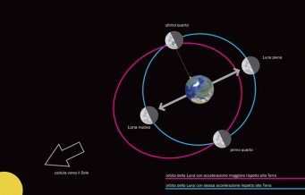 L’esperimento più sensibile per verificare l’uguaglianza tra massa inerziale e massa gravitazionale è quello che misura la distanza tra la Terra e la Luna. I due corpi celesti hanno pesi diversi e sono entrambi in caduta libera verso il Sole. Sulla Luna è stato posizionato un riflettore che rimanda indietro un raggio laser proveniente dalla Terra e che permette di misurare la distanza Terra-Luna. Se vi fosse una differenza tra massa inerziale e massa gravitazionale, la distanza reciproca tra i due varierebbe in funzione della fase lunare (linea rosa); non si osserva invece alcuna variazione della distanza al variare della fase lunare (linea blu)