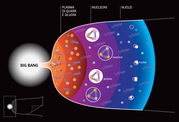 I primi minuti dell'evoluzione dell'universo (vd. anche fig. c in Ai confini della realtà, ndr). La transizione da plasma di quark e gluoni a nucleoni avviene ca. un decimillesimo di secondo dopo il Big Bang. I primi nuclei leggeri si formano alcuni secondi dopo.