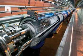 Ricostruzione virtuale dell’interno dell’acceleratore Lhc. Sono visibili il complesso sistema di criogenia, che mantiene i magneti superconduttori a circa 2 kelvin, e i due fasci di particelle che viaggiano sulle due traiettorie di 27 chilometri.