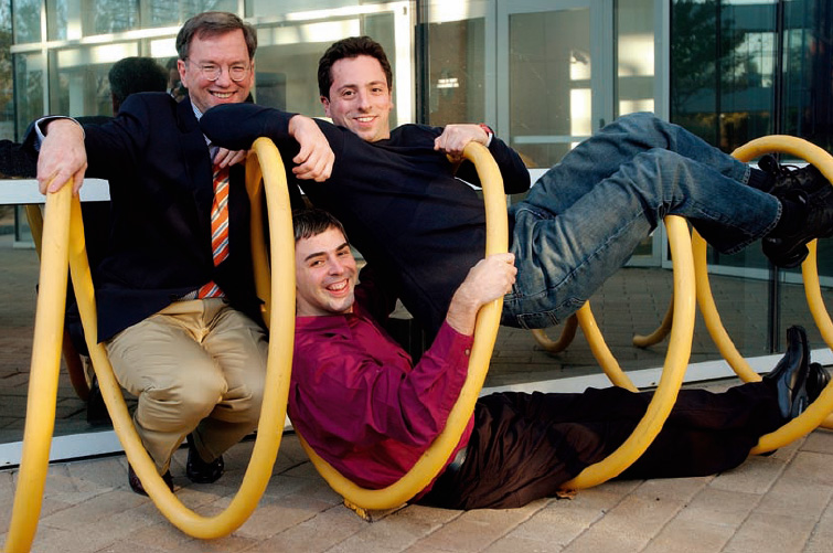 Sergey Brin (in alto) e Larry Page (sotto), fondatori di Google, assieme a Eric Schmidt (sulla loro sinistra), terzo uomo del Consiglio di Amministrazione della società dal 2001.