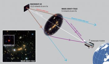 In basso a sinistra, l’immagine di un lontano ammasso di galassie (dal nome MACS J0647+7015) osservato per lungo tempo con il telescopio spaziale Hubble. L’enorme quantità di materia oscura presente nell’ammasso agisce come lente gravitazionale e fa convergere verso di noi la luce proveniente dalle galassie retrostanti (come visualizzato al centro della figura). Tra queste, la galassia MACS0647-JD, visibile nel riquadro, è la più lontana mai osservata. La sua luce arriva a noi oggi essendo partita 13,3 miliardi di anni fa.