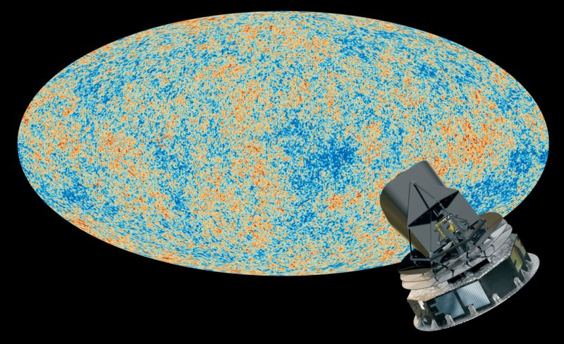 Mappa dell’universo primordiale ottenuta dal satellite Planck (la cui immagine è stata aggiunta alla mappa), tramite misure del fondo cosmico di microonde. Le macchie rosse e blu rappresentano piccole fluttuazioni di temperatura del gas incandescente che riempiva l’universo 13,7 miliardi di anni fa, 380.000 anni dopo il Big Bang: le parti blu sono le parti più fredde, le parti rosso-arancioni quelle più calde. Queste fluttuazioni potrebbero essersi generate nel periodo dell’inflazione (vd. [as] Crescita in tempi di inflazione) pochi attimi dopo il Big Bang. Dalle risultanti fluttuazioni di densità si formeranno poi tutte le strutture cosmiche (galassie, ammassi di galassie, superammassi).