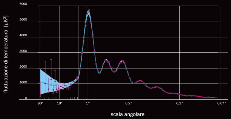 Lo spettro di potenza della mappa del fondo cosmico di microonde di fig. c. In funzione delle dimensioni angolari delle fluttuazioni di temperatura, è riportata l’entità delle fluttuazioni. La successione di picchi è dovuta alle oscillazioni del gas incandescente di materia e luce che riempiva l’universo 13,7 miliardi di anni fa. I punti rossi rappresentano i dati sperimentali, le barre rosse i loro errori di misura. La linea blu rappresenta la previsione teorica, che risulta perfettamente in accordo con i dati.