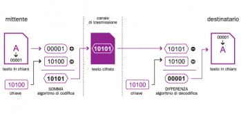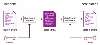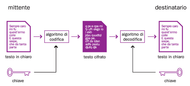 a. Per cifrare il testo di un messaggio (il testo in chiaro), il mittente lo codifica utilizzando un algoritmo, un procedimento generale di scrittura segreta, i cui dettagli sono precisati solo scegliendo una chiave. Applicando insieme chiave e algoritmo a un testo in chiaro, questo è trasformato in un testo cifrato. Il testo cifrato può essere intercettato da una spia durante la trasmissione al destinatario, ma (almeno nel caso in cui l'algoritmo usato sia sufficientemente raffinato) la spia non dovrebbe essere in grado di decodificarlo. Il destinatario, invece, conoscendo l'algoritmo e la chiave usati dal mittente, può ripristinare il testo in chiaro.