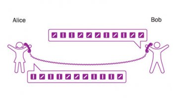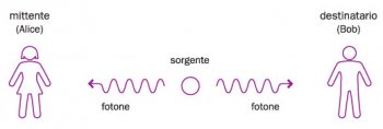 “Le straordinarie potenzialità dell'applicazione di alcuni aspetti della meccanica quantistica, tra i quali ad esempio l'entanglement, hanno portato alla nascita della moderna teoria quantistica dell'informazione. Utilizzata oggi per lo scambio di informazioni protette, anche nelle comuni applicazioni del commercio telematico o per la protezione della privacy nell'uso della posta elettronica, la crittografia ha origini molto antiche e ha raggiunto nella sua evoluzione livelli elevatissimi, con l'obiettivo di rendere i protocolli di scambio sempre più sicuri. Tuttavia, per quanto il protocollo sia sofisticato, il problema dell'inviolabilità dall'esterno non è mai completamente risolto ed è praticamente impossibile ottenere la certezza della segretezza. La natura del problema è la seguente. Se due persone – che chiameremo Alice e Bob – vogliono trasmettersi un messaggio senza che nessun'altro sia in grado di leggerne il contenuto, useranno una chiave per cifrare il messaggio, cioè trasformarlo in modo da renderlo irriconoscibile attraverso un processo di codifica (un algoritmo). Solo chi è in possesso della chiave può ricostruire il messaggio originale (vd. fig. a).