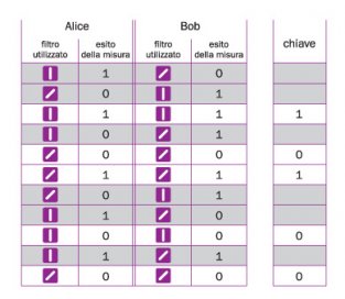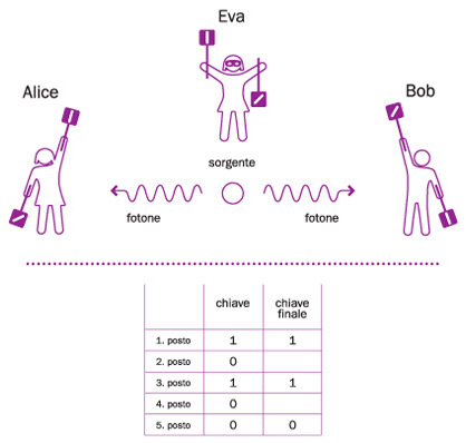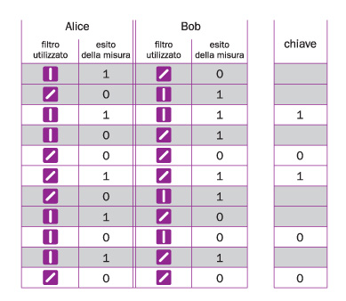 Passo 4.Eliminando tutti i casi in cui hanno eseguito misure diverse (ovvero in cui i numeri delle rispettive sequenze possono anche differire), Alice e Bob rimangono ciascuno con la stessa sequenza di 0 e 1, che hanno due caratteristiche essenziali: sono assolutamente identiche e la sequenza degli 0 e degli 1 è del tutto casuale. Questa è la loro chiave segreta! In particolare, nella tabella in figura sono evidenziati in grigio i casi in cui Alice e Bob hanno condotto misure diverse. Eliminando questi casi, si ottiene la sequenza “pulita” riportata nella terza colonna, cioè la chiave (10100 nel nostro esempio).