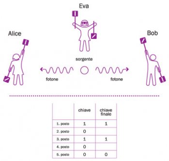 Per verificare se Eva sia intervenuta, Alice e Bob si comunicano pubblicamente un certo numero di esiti di misura che compongono la chiave segreta. Per un numero sufficientemente elevato di esiti comunicati (molti più di quelli rappresentati nella tabella dell’esempio in figura), Alice e Bob potranno essere praticamente certi di scoprire se Eva sia intervenuta, perché riscontrerebbero in questo caso almeno un esito discorde, pur avendo eseguito lo stesso tipo di misura. In tal caso dovrebbero ricominciare da capo tutto il procedimento. Altrimenti, rigettando gli esiti enunciati pubblicamente, che a questo punto non sarebbero più segreti, sarà possibile ottenere la chiave segreta da utilizzare nel caso non vi sia stato un intervento di Eva. Nell’esempio raffigurato in figura, Alice e Bob stabiliscono di comunicarsi i numeri 0 o 1 della chiave segreta alla posizione pari (al secondo e quarto posto). In questo modo, se uno di questi numeri fosse diverso per Alice e Bob, i due personaggi saprebbero di essere stati spiati e potrebbero decidere di ricominciare da capo. Nel caso contrario, utilizzeranno la nuova chiave segreta (la seconda colonna della tabella in figura), più corta della prima, per cifrare e decodificare il messaggio.