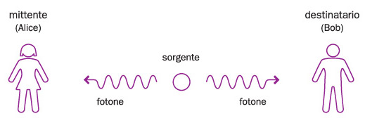 Passo 1. Una sorgente emette ogni secondo una coppia di fotoni entangled, che si propagano in direzioni opposte tra un mittente (Alice) e un destinatario (Bob), posti a una distanza qualsiasi dalla sorgente. In generale, lo stato di polarizzazione del sistema dei due fotoni entangled sarà una combinazione lineare (sovrapposizione di stati quantistici) di stati di polarizzazione ortogonali tra loro (ad esempio verticale e orizzontale, oppure a 45° e a 135°, vd. approfondimento).