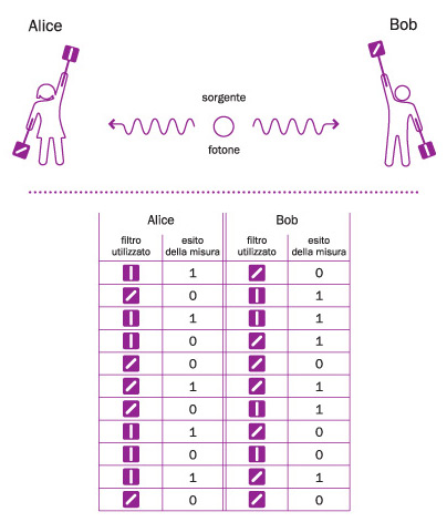 Passo 2.Per generare la chiave comune, Alice e Bob stabiliscono di eseguire una serie di misure di polarizzazione sulle varie coppie di fotoni entangled emesse in successione dalla sorgente, usando arbitrariamente filtri che rivelano se la polarizzazione è verticale o a 45° (indicati nella figura con due differenti palette) e senza comunicarsi la sequenza delle misure che eseguiranno. Indicando con 1 o 0 l’esito della misura (1 se il fotone supera il “test” di misura di polarizzazione – ad esempio il filtro è di tipo “verticale” e il fotone riesce a superarlo – e 0 se non lo supera) la sequenza degli esiti registrati da Alice e Bob sarà una sequenza del tipo 10100101010, ricordando che in ogni misura si ha la stessa probabilità di avere come esito 1 o 0. Nella tabella in figura sono indicati, sia per Alice che per Bob, il tipo di misura effettuata (il filtro utilizzato, verticale o a 45°) e l’esito corrispondente.