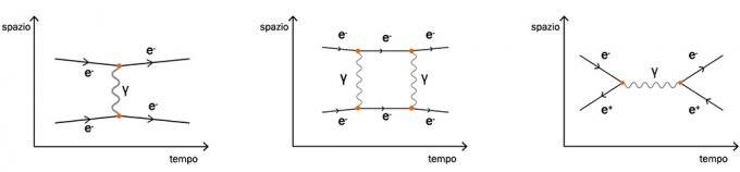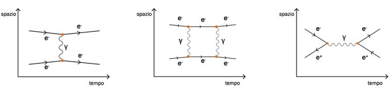 Il diagramma di Feynmann che rappresenta l’urto di due elettroni, in cui si scambia solo un fotone. Le linee e- rappresentano i due elettroni, la linea ondulata tra le due è il fotone mediatore che trasferisce energia e impulso da un elettrone all’altro. Al centro, l’urto di due elettroni con lo scambio di due fotoni. A destra, il diagramma di Feynmann dell’annichilazione elettrone-positrone in un fotone virtuale. Le linee dei positroni puntano indietro nel tempo.