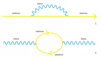 Due diagrammi di Feynman (vd in Asimmetrie n. 19 L'alfabeto della natura, ndr), che descrivono un elettrone libero (1) e un fotone libero (2). Un elettrone libero non può emettere un fotone, o meglio lo può fare solo se “riassorbe” il fotone emesso dopo un tempo “brevissimo”. In questo tempo brevissimo sia l’elettrone che il fotone sono detti “virtuali” e possono assumere valori qualsiasi di energia, purché la somma delle due energie sia pari a quella dell’elettrone prima e dopo l’emissione/assorbimento del fotone. Allo stesso modo, un fotone libero non può trasformarsi in una coppia elettrone-positrone, se non per un tempo brevissimo. Come nel caso 1) l’elettrone e il positrone sono particelle virtuali con energia qualsiasi e con l’unico vincolo che la somma delle loro energie sia uguale a quella del fotone prima e dopo la produzione/annichilazione della coppia.