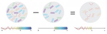 Rappresentazione schematica del concetto di rinormalizzazione. La prima sfera rappresenta la somma di tutte le energie che possono assumere le particelle virtuali in un determinato processo. Anche se questa somma è infinita, può essere rinormalizzata sottraendogli la somma di tutte le energie superiori a un certo valore, indicato con lambda in figura (seconda sfera). Quello che resta, la terza sfera in figura, è una quantità ben definita. La terza sfera descrive quantità misurabili che accadono nei processi fisici a energie inferiori di lambda, mentre la prima e la seconda, che hanno valore infinito, descrivono quantità o parametri non misurabili.