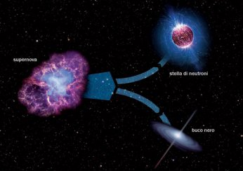 Per effetto del collasso gravitazionale, una stella di grande massa può esplodere in una supernova, il cui residuo è una nebulosa come quella a sinistra nella figura. Se il nocciolo centrale residuo (il pallino bianco appena visibile al centro della nebulosa) ha una massa tra 1,5 e 3 masse solari, la supernova evolve in una stella di neutroni. Se il nocciolo ha una massa maggiore di 3-4 volte la massa del Sole, il collasso continua fino a dare luogo a un buco nero.