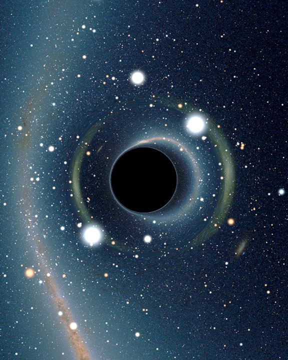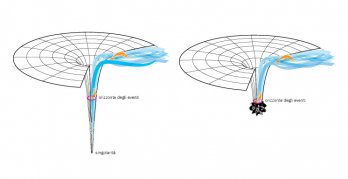 Per capire cosa succede alla materia nelle vicinanze di un buco nero possiamo ricorrere a una semplice analogia: pensiamo al corso di un fiume, vicino a una grande cascata. Un pesce potrà risalire il fiume controcorrente e tornare verso acque più tranquille soltanto fino al momento in cui la velocità dell’acqua che si avvicina alle rapide diventa uguale a quella del pesce. A quel punto, per quanto si sforzi, il pesce sarà trascinato nella cascata senza accorgersene (nel buco nero avrebbe oltrepassato l’orizzonte degli eventi). A sinistra è raffigurato un buco nero classico, nel cui centro la densità tende all’infinito. Ciò è rappresentato dalla punta (la cosiddetta singolarità). A destra la raffigurazione di un buco nero secondo la teoria delle stringhe.
