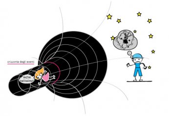 Una possibile soluzione a queste contraddizioni è offerta dalla teoria candidata a fornire una corretta descrizione della gravità quantistica: la teoria delle stringhe. In base ad essa, i quanti fondamentali non sono particelle elementari puntiformi, ma oggetti estesi noti come stringhe. Per la teoria delle stringhe, un buco nero è un oggetto molto diverso da quello che conosciamo dalla teoria classica di Einstein: l’interno è completamente alterato e la sua nuova struttura, più complessa ma più regolare (vd. fig. a), permette all’informazione di sfuggire all’esterno, se pure dopo tempi estremamente lunghi, risolvendo la contraddizione tra l’evaporazione e la conservazione di informazione. In particolare, lo studio dei buchi neri all’interno della teoria delle stringhe ha portato all’affermazione di un principio, chiamato principio olografico, secondo il quale la gravità sarebbe la manifestazione di una teoria quantistica che vive in uno spazio con un numero minore di dimensioni, proprio come succede in un ologramma, dove un’immagine apparentemente tridimensionale è realizzata tramite una struttura bidimensionale. Se il principio olografico è corretto, essendo le teorie quantistiche unitarie – esse conservano cioè l’informazione – qualunque processo fisico, inclusa la formazione e l’evaporazione dei buchi neri, deve essere unitario. Proprio a seguito dell’affermarsi di queste idee Hawking ha finalmente ammesso la propria sconfitta nella scommessa con Preskill. Questo però non significa saper tutto su questi oggetti affascinanti, anzi, il loro studio è una continua fonte di sorprese, di importanti lezioni e di accesi dibattiti. Ancora oggi si discute sulla vera natura delle modifiche della loro struttura interna necessarie per risolvere il paradosso dell’informazione. Infatti, un ipotetico osservatore che cada in un buco nero non si accorge del momento in cui ha passato l’orizzonte degli eventi e rimane intrappolato al suo interno (vd. fig. b). D’altra parte, le modifiche introdotte per spiegare come l’informazione viene riemessa dal buco nero sembrano implicare l’esistenza di un muro di materia e radiazione che si accumula all’orizzonte e che, data l’elevatissima temperatura che ne consegue, non può essere compatibile con la sopravvivenza dell’avventato visitatore. Dunque chi cade nel buco nero sa di sopravvivere, mentre chi lo osserva da fuori ne constatata senza ombra di dubbio la fine. Un altro paradosso la cui soluzione ci farà capire meglio questi affascinanti oggetti e la vera natura della forza di gravità.