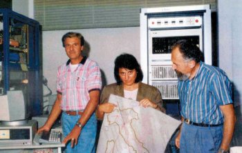 Il gruppo che ha realizzato il primo collegamento europeo ad alta velocità tra computer dal Cnaf, a Bologna, al Cern, il 6 luglio 1989: da sinistra, Massimo Cinque, Antonia Ghiselli e Umberto Zanotti.