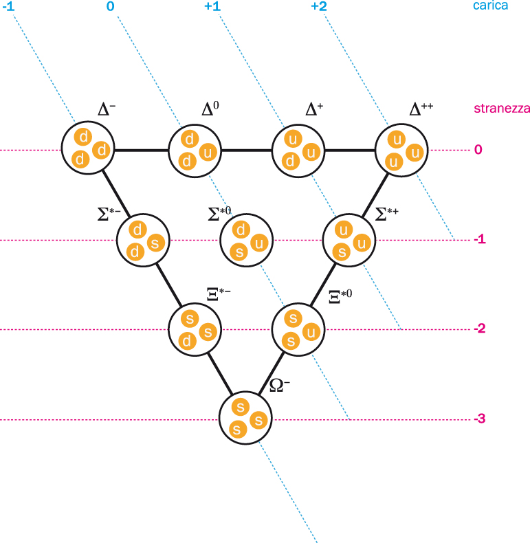 b.Il decupletto barionico, costituito dalle particelle Δ, Σ*, Ξ* e Ω, quest’ultima scoperta nel 1964. Per ogni particella è indicata la composizione in quark up (u), down (d) e strange (s), mentre la griglia identifica carica e stranezza delle diverse particelle.