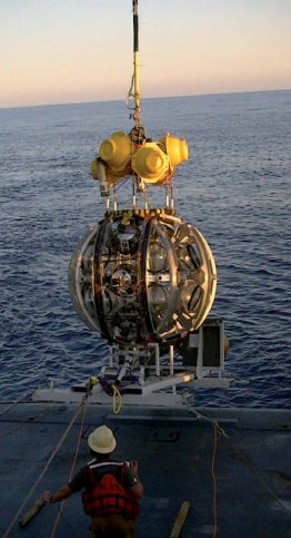 Calata a mare agli inizi del maggio del 2014 della seconda delle cento strutture che formeranno il telescopio sottomarino per neutrini Km3net, in costruzione negli abissi al largo della Sicilia a 3500 m di profondità.