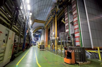 Il rivelatore Opera nella sala C dei Laboratori del Gran Sasso. Nelle regioni più scure sono collocati circa 15.000 "mattoni" di piombo e lastre fotografiche per la ricostruzione micrometrica delle interazioni dei neutrini.