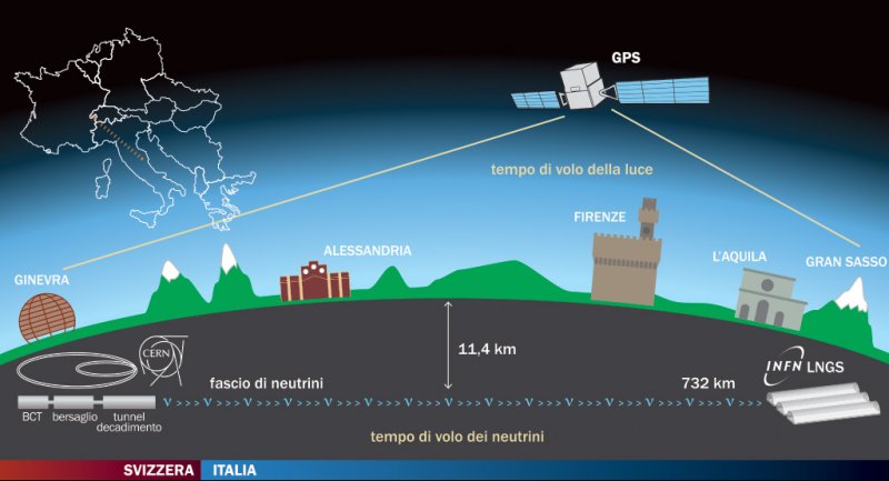 Non essendo noto il punto di produzione del neutrino all’interno del tubo di decadimento, la misura del tempo di volo viene effettuata prendendo come istante iniziale quello del passaggio del pacchetto di protoni, che ha dato origine al neutrino rivelato, in un punto prefissato posto prima del Biografia bersaglio (nel Beam Current Transformer, Bct), e come istante finale quello in cui il neutrino ha interagito in un certo punto dell’apparato ai Lngs (il che accade molto raramente). Anche se non si può associare al neutrino rivelato il protone “genitore” all’interno del pacchetto, i pacchetti sono così compatti che si riesce a individuare l’istante iniziale con una precisione di pochi nanosecondi. Questa procedura assume che, dall’istante iniziale all’istante in cui viene prodotto il neutrino, i protoni e i loro prodotti di interazione viaggino alla velocità della luce. Essendo questo intervallo molto minore dell’intera durata del viaggio verso i Lngs, l’approssimazione è ampiamente giustificata. La misura si riduce quindi a collegare i tempi iniziale e finale con quelli di due ricevitori Gps posti rispettivamente all’esterno dei laboratori del Cern e dei Lngs. Questa operazione, tra le più delicate dell’intera procedura, è in parte svolta utilizzando la tecnologia White Rabbit e in parte mediante misure di calibrazione dei vari ritardi temporali introdotti dalla propagazione dei segnali all’interno del rivelatore. Per un altro aspetto determinante, il modo con cui vengono agganciati tra loro i due segnali Gps, si è fatto uso della tecnica common view, in cui solo i segnali emessi dai satelliti visti simultaneamente da entrambi i siti vengono presi in considerazione. L’intera procedura ha consentito di misurare il tempo di volo con una precisione di qualche nanosecondo, un milione di volte inferiore rispetto alla durata dell’intero viaggio dei neutrini.