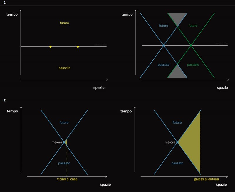Esperienze come questa ci mostrano che la nostra intuizione elementare su come funziona il tempo non è corretta. O meglio, che questa intuizione non è adatta a descrivere il mondo, non appena si esce dal regime di dimensioni, velocità e precisione a cui siamo abituati. Se si pongono due orologi precisi uno più in alto e uno più in basso, questi misurano due intervalli di tempo diversi, fra il momento in cui sono stati separati e il momento in cui vengono ravvicinati. L’orologio tenuto più in basso indica che è passato meno tempo e l’orologio tenuto più in alto indica che è passato più tempo: il tempo non passa eguale per tutti (vd. [as] radici: Dilatazione dei tempi alla prova., ndr). Oggi abbiamo orologi molto precisi, e questa differenza di velocità dello scorrere del tempo si misura anche a dislivelli di pochi decimetri. Il tempo è qualcosa di più complesso di quanto immaginiamo comunemente.