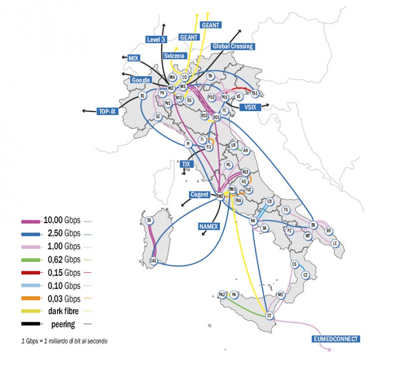 b. Schema della rete Garr. Sono evidenziate a colori le velocità di trasmissione dei dati tra un nodo e un altro. Una dark fibre è una fibra ottica che non trasporta servizi forniti da un operatore di telecomunicazioni, ma che viene “illuminata” mediante apparati acquistati e gestiti dal Garr. Con il termine peering si considera il rapporto che due organizzazioni stabiliscono al fine di scambiare traffico dati, sia a titolo oneroso che gratuito. Ad esempio, con Google (fornitore di contenuti su internet) è a titolo gratuito, mentre con Level3/Global Crossing/Cogent è oneroso.