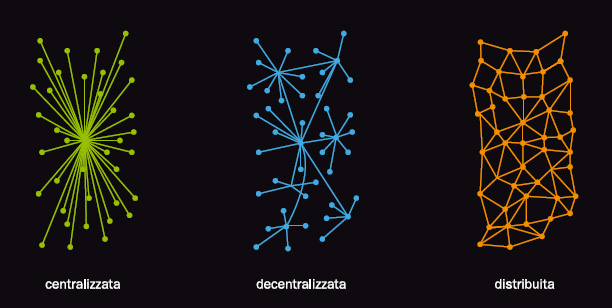 1.Le tre tipologie di rete: centralizzata, decentralizzata e distribuita. La prima versione di internet è stata concepita negli Stati Uniti come una rete distribuita dal nome Arpanet. |