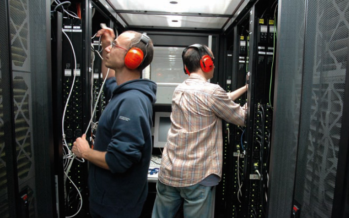 c. Il Tier 1 di Bologna, il nodo italiano della rete Grid di Lhc al Cnaf. I ricercatori indossano delle cuffie a causa dell’eccessivo rumore prodotto dai computer.