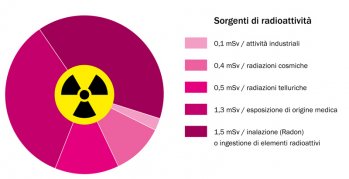 In figura sono rappresentate le varie sorgenti di radiazioni ionizzanti che contribuiscono alla dose media ricevuta in un anno da ciascun italiano, espresse nell'unità di misura appropriata, il Sievert. L'esposizione legata a esami radiodiagnostici è chiaramente un valore medio su tutto il campione, è assai diversa a seconda delle vicende personali, e rappresenta comunque una grossa parte della dose totale. Va notato però che anche la componente di origine naturale non è uniforme tra la popolazione, ma presenta ampia variabilità in base a molti fattori, quali la latitudine di residenza, la composizione geologica del suolo, i materiali di costruzione delle abitazioni e dei luoghi di lavoro, o l'altitudine sul livello del mare. Quest'ultima variabile è particolarmente rilevante nel caso dei raggi cosmici, che rappresentano circa il 10% del totale. Infatti, la radiazione che ci attraversa è costituita dagli sciami di particelle prodotte nell'atmosfera dai raggi cosmici primari, sciami che sono composti da un numero crescente di particelle man mano che penetrano nell'atmosfera, raggiungono un massimo intorno ai 10.000 metri per poi affievolirsi in prossimità della superficie terrestre. La dose ricevuta dal personale di volo delle compagnie aeree è significativamente superiore a quella dei pescatori! La vita convive da sempre con le radiazioni cosmiche: al livello del mare, ciascuno di noi è attraversato da un centinaio di particelle al secondo, per lo più muoni e, in minor misura, elettroni e positroni. Ci attraversano anche i neutrini, un numero sterminato di neutrini: il Sole ne produce qualcosa dell'ordine di 1038 al secondo, e sulla Terra ne arrivano quasi 100 miliardi al secondo, per ogni centimetro quadrato. Fortunatamente per noi, le loro interazioni con la materia sono estremamente rare, (attraversano senza alcun problema il pianeta Terra!): per i neutrini, siamo "trasparenti" e non ci creano alcun problema di salute. [C. S.]
