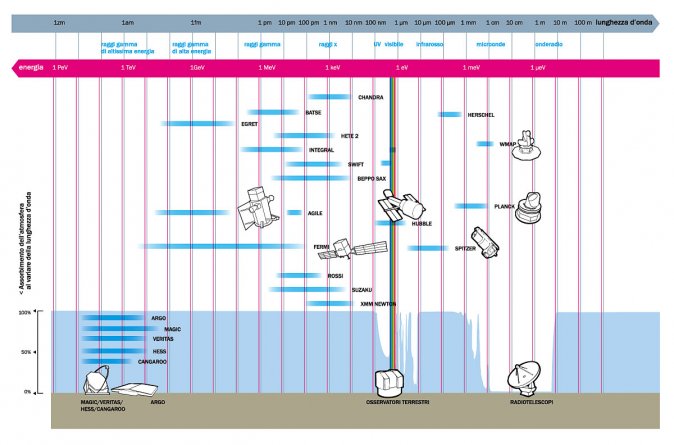 Ma lo studio dei raggi cosmici è proseguito. L’osservazione “diretta” delle particelle che arrivano dallo spazio richiede di porre i rivelatori al di sopra dell’atmosfera terrestre. Questo è possibile usando speciali palloni stratosferici che possono arrivare ai confini dell’atmosfera o, in modo più difficile ma più efficace, ponendo gli strumenti su satelliti in orbita attorno alla Terra. Recentemente il satellitePamela, lanciato il 15 giugno del 2006 dal cosmodromo russo di Baikonur ha ottenuto risultati molto importanti. Di grandissimo interesse sono le misure, con un dettaglio senza precedenti, dei flussi di antimateria (antielettroni e antiprotoni) nei raggi cosmici. Una parte di queste antiparticelle potrebbe essere, infatti, generata dall’invisibile materia oscura presente nella nostra galassia. Con il crescere dell’energia, il flusso dei raggi cosmici diventa sempre più piccolo e le osservazioni dirette diventano impossibili, perché gli strumenti che si possono mettere su un pallone o un satellite non sono sufficientemente grandi. Altre tecniche “indirette” sono possibili. Alle energie più elevate lo sciame prodotto da una singola particella primaria può contenere anche decine di miliardi di particelle secondarie. Una parte dello sciame raggiunge il suolo sotto forma di un disco sottile (qualche metro di spessore) e con un raggio che va da qualche centinaio di metri fino a qualche chilometro. Rivelatori al suolo possono osservare l’arrivo di uno sciame e ricostruire la direzione, l’energia e il tipo di particella primaria. L’aria attraversata dallo sciame assorbe energia dalle particelle e riemette istantaneamente una tenue luce di fluorescenza: nelle notti senza luna, telescopi speciali sono in grado di osservare questi deboli bagliori.