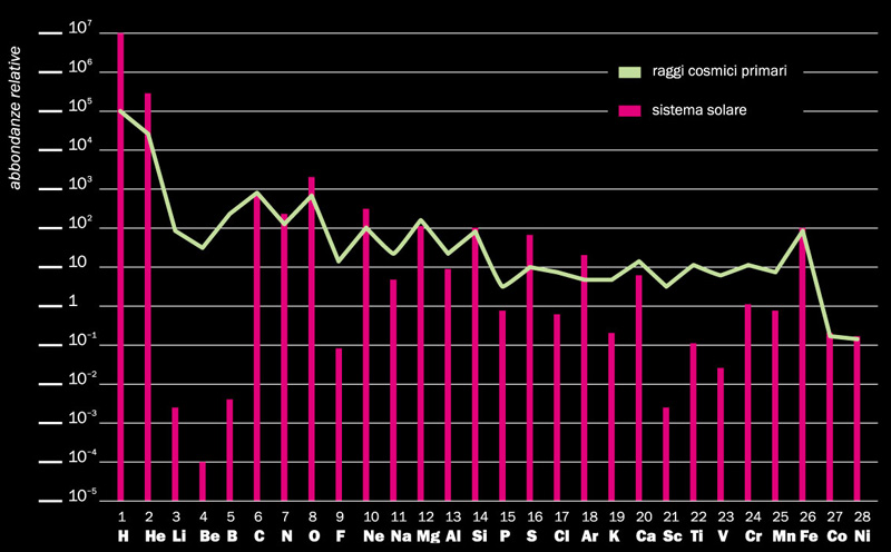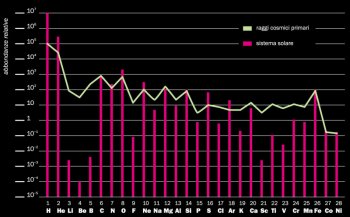 La composizione dei raggi cosmici che arrivano dallo spazio non è poi così diversa da ciò che ci circonda, nel nostro sistema solare. In figura, sono rappresentate le abbondanze relative (ponendo il silicio arbitrariamente a 100) dei primi elementi della tavola periodica, nel caso del Sistema Solare (barre magenta) e dei raggi cosmici primari (linea spezzata verde). La scala è logaritmica e la figura, a prima vista, potrebbe trarre in inganno: infatti, nel Sistema Solare l'idrogeno e l'elio rappresentano il 91,1% e l'8,8% rispetto al numero totale di nuclei, e tutti gli altri elementi contribuiscono per il rimanente 0,1%! Nei raggi cosmici, le proporzioni tra i vari elementi sono simili a quelle nel sistema solare, ma con alcune significative differenze; in particolare, nei raggi cosmici sono molto più abbondanti i nuclei leggeri, tra elio e carbonio, e quelli più leggeri del ferro: essi sono il risultato della frammentazione di nuclei più pesanti a seguito di urti con la materia interstellare. [C. S.] |