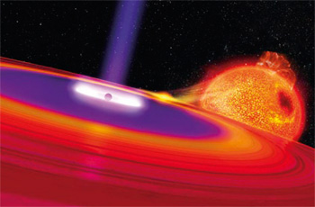 Rappresentazione artistica di un microquasar, un sistema binario formato da un buco nero in orbita ravvicinata con una stella “normale”. La materia della stella, precipitando nel buco nero, acquista energia cinetica. Parte di questa energia energia è riemessa sotto forma di due jet di radiazione e materia emessi lungo l’asse di rotazione del buco nero. All’emissione dei jet è associata l’accelerazione di particelle.