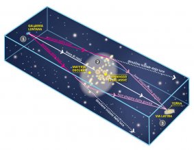 2. Una “lente” di materia oscura. Parte della luce attraversa un grande ammasso di galassie circondato da materia oscura posto fra la Terra e la galassia lontana. La gravità della materia oscura agisce come una lente, piegando le traiettorie della luce.