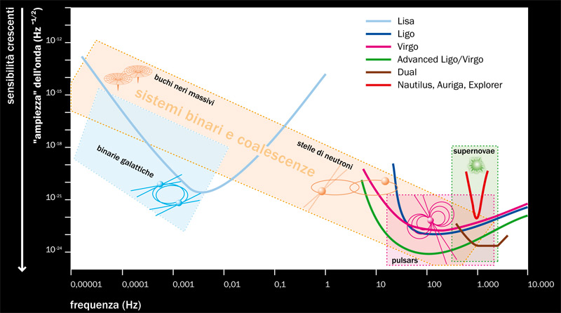 curve rappresentano la sensibilità, per onde gravitazionali di diversa