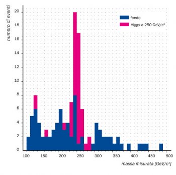 b. Se l’Higgs avesse una massa di 250 GeV/c2, dopo un anno di presa dati si otterrebbe un diagramma della distribuzione della massa misurata simile a quello riportato in figura. In blu si vedono gli eventi che potrebbero essere interpretati come segnali di Higgs ma non lo sono (il rumore di fondo). Si vede come il segnale spicca intorno ai 250 GeV/c2 (in rosso), ovvero che gli eventi ricostruiti che provengono da un Higgs, si accumulano a un particolare valore della massa. Il segnale è molto pulito perché il picco rosso è stretto e ben visibile e il fondo blu è abbastanza regolare e mai troppo alto. Sono questi gli eventi che si spera di osservare in Atlas e Cms per la scoperta dell’Higgs!