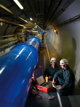 a. Due ingegneri controllano uno dei 1.232 magneti dipolari distribuiti lungo il tunnel di Lhc che fino al 2000 ospitava il suo precursore, il Lep (Large Electron-Positron Collider). Il tunnel si trova a 100 m di profondità sotto la periferia della città di Ginevra, alla frontiera tra Svizzera e Francia.