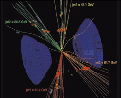 c. Un evento osservato nell’esperimento Delphi del Lep. L’elettrone e il positrone incidenti hanno interagito e prodotto 2 bosoni nello stato finale. Questi a loro volta decadono in 2 quark ciascuno, che a loro volta producono un jet ciascuno. Un jet è un insieme di particelle che hanno la stessa origine e sono racchiuse in un cono con uno stretto angolo di apertura. La massa può essere determinata dalle variabili cinematiche (in questo caso l’energia) dei due jet di decadimento. Se si associa il jet 1 al jet 2 e il jet 3 al jet 4, si risale alla produzione di due bosoni Z. Viceversa, se si sceglie l’accoppiamento del jet 1 con il 4 e il 2 con il 3, si ha un bosone Z e un candidato di Higgs di massa 113 GeV. L’analisi su eventi simulati, tuttavia, determinava che questo evento era compatibile con la produzione di due bosoni Z e che quindi, probabilmente, non si era prodotto un bosone di Higgs.