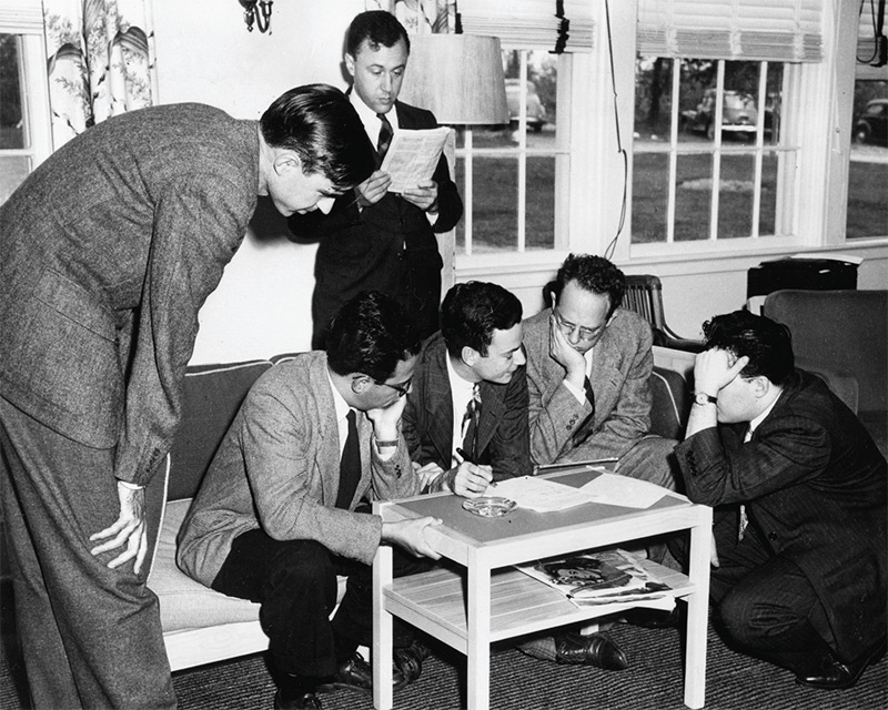 Un gruppo di fisici attorno a Feynman (al centro davanti al tavolino), tra cui Schwinger (tutto a destra nella foto), intenti in una discussione durante una conferenza scientifica nel giugno del 1947.
