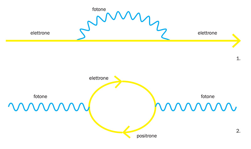 b.Due diagrammi di Feynman (vd in Asimmetrie n. 19 L'alfabeto della natura, ndr), che descrivono un elettrone libero (1) e un fotone libero (2). Un elettrone libero non può emettere un fotone, o meglio lo può fare solo se “riassorbe” il fotone emesso dopo un tempo “brevissimo”. In questo tempo brevissimo sia l’elettrone che il fotone sono detti “virtuali” e possono assumere valori qualsiasi di energia, purché la somma delle due energie sia pari a quella dell’elettrone prima e dopo l’emissione/assorbimento del fotone. Allo stesso modo, un fotone libero non può trasformarsi in una coppia elettrone-positrone, se non per un tempo brevissimo. Come nel caso 1) l’elettrone e il positrone sono particelle virtuali con energia qualsiasi e con l’unico vincolo che la somma delle loro energie sia uguale a quella del fotone prima e dopo la produzione/annichilazione della coppia.