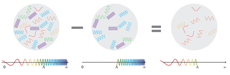 c.Rappresentazione schematica del concetto di rinormalizzazione. La prima sfera rappresenta la somma di tutte le energie che possono assumere le particelle virtuali in un determinato processo. Anche se questa somma è infinita, può essere rinormalizzata sottraendogli la somma di tutte le energie superiori a un certo valore, indicato con lambda in figura (seconda sfera). Quello che resta, la terza sfera in figura, è una quantità ben definita. La terza sfera descrive quantità misurabili che accadono nei processi fisici a energie inferiori di lambda, mentre la prima e la seconda, che hanno valore infinito, descrivono quantità o parametri non misurabili.
